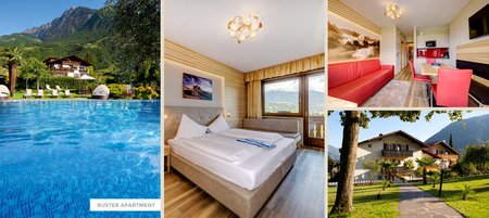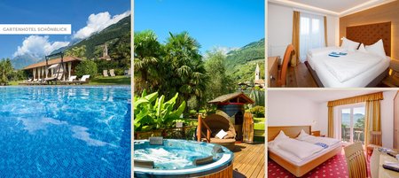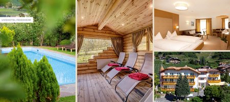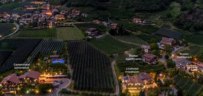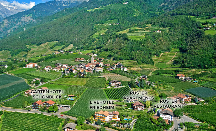 Zwei Hotels - das Livehotel Friedheim und das Gartenhotel Schönblick zuzüglich der exklusiven Rosensuite sowie das Apartmenthaus Ruster mit den neu renovierten Ferienwohnungen und das bekannte Ruster Restaurant bilden in Algund bei Meran ein Ferien-Hotel Resort der einmaligen Art.